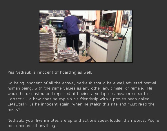 This page includes a whole series of personal attacks on me. It has my user name in the title so will be picked up by Google searches at once, trashing my name. 1:- "Stalks us" 2:- "Constantly criticises everything we say" 1:- my broadcasts are announced in the chatterbox. How can an "anon" be stalked? 2:- Repeated lies are posted about me in said chatterbox - almost all anonymously. |