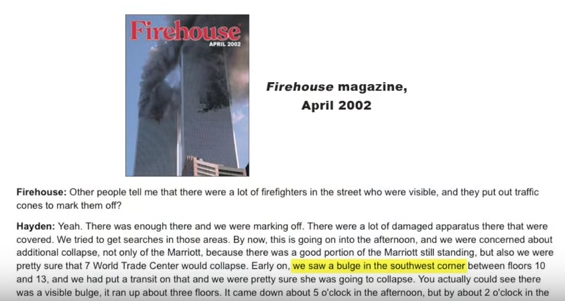 This refers to an observed earlier sign of structural failure in building 7 which led to the withdrawal of the fire fighting teams. A damaged water main had cut the sprinkler system in the building. The cover image is obviously not building 7. |