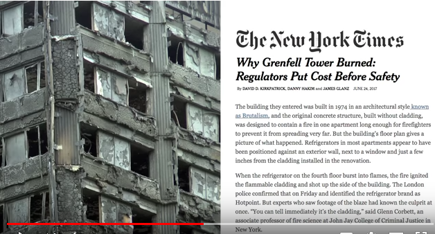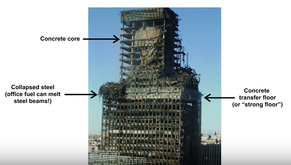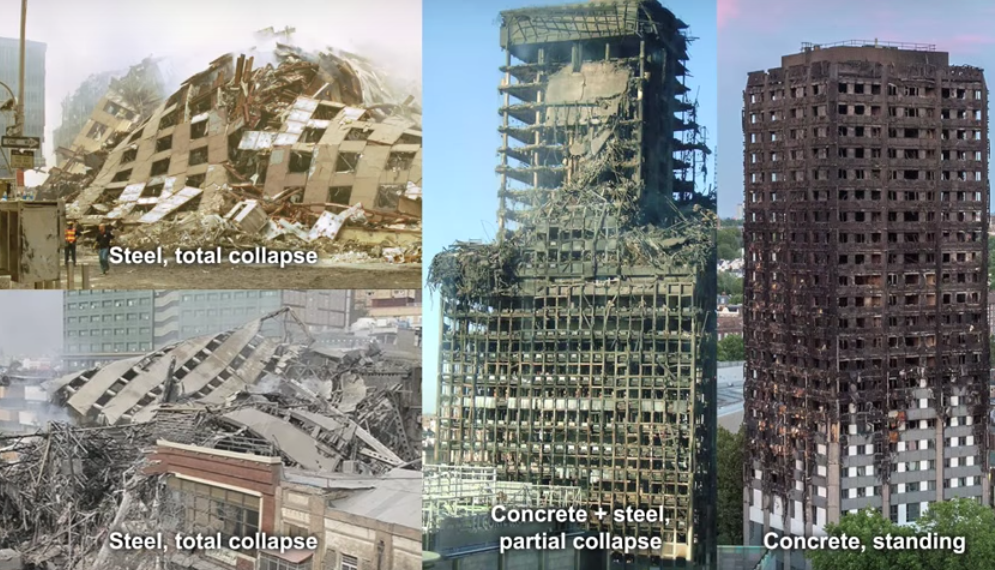 Note the relatively massive scale of the vertical columns at Grenfell. This is the reason why there was no major collapse of the overall structure. The "rebar" element was protected by the concrete. There is no such thick protection in steel frame buildings. Messrs Sponheim and Avery ignore these basic facts. There was no explosive present in the WTC collapses. As regards Grenfell, the fire crews appear to have approached the fire as if the building was unmodified and put the initial fire out. They were unaware it had escaped via the window to the cladding until too late. |