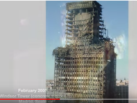 This is the Windsor tower in Madrid, Spain. Part of its upper structure was steel framed. |