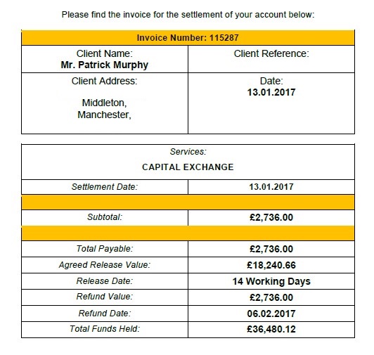 EBS claim that they can get back my cash from BM. They stated that a fee of over £4,000.00 would be needed to facilitate this recovery by a "capital Exchange" from the escrow account. When I said I didn't have that amount of funds they then stated they could recover half the funds on payment of £2,736.00, which I agreed to. This was to be done in 15 working days from the arrival of my funds in their account. I would then use the proceeds to reclaim the rest of the funds.(see invoice below) The 15 days passed, but no sign of the funds, |