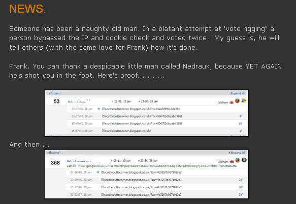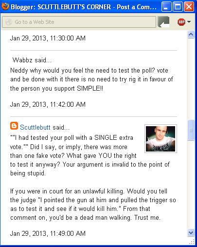 When the poll was opened I was first to vote (before 10.00 AM) and at the time asked if the poll was secure. That should be in the logs for Jan 28th. I asked because the chatango box is secure - It blocks any computer connected to the same router (so would, for instance block a large network too). I did not get an answer from the blog, so checked on a different computer later that afternoon. A second vote did register. Later that evening I informed Wabbz, one of the bloggers what I had found out and told her of the extra vote. She was surprised by this, so I tested again on the second computer and was, indeed blocked. That showed that the block is actually by computer, not by router IP. The post shown right DOES tell how to bypass the checks. I did NOT tell anybody that. As to the "proof" - that appears to suggest (as far as I can see) that Scuttle is alleging I voted more than twice, which is UNTRUE |