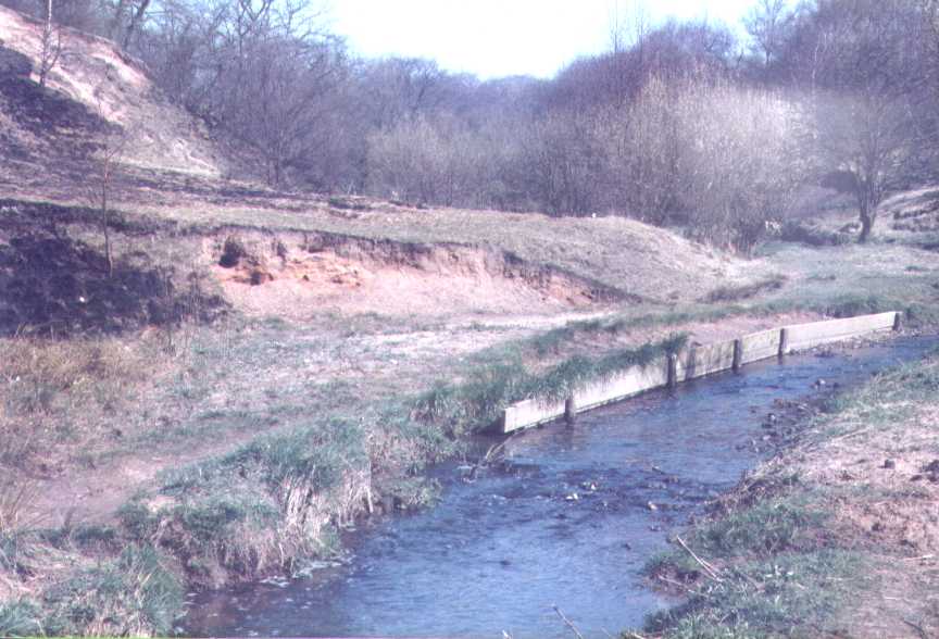 Both erosion and deposition can clearly be seen here. The boards have attempted to restrain the channel, and are at a point where the rate of flow clearly changes. Can you see any reasons why there has been so much erosion middle left and yet there are sandy deposits in the foreground? |