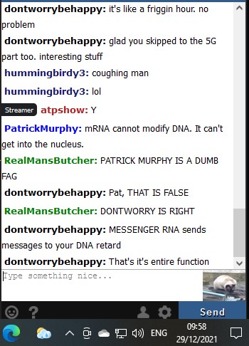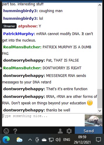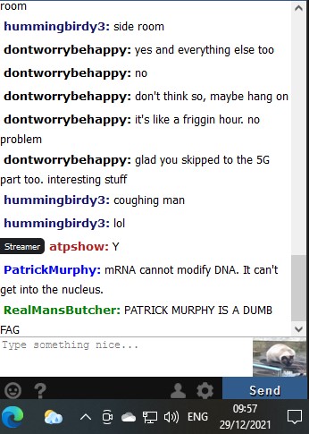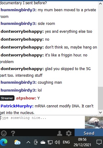 I dropped in on this channel on the morning of the 29th December. More anti vaccine stuff being peddled. The vaccines are not killing children, nor is the messenger (from DNA) RNA changing anything in the nucleus of cells. |
