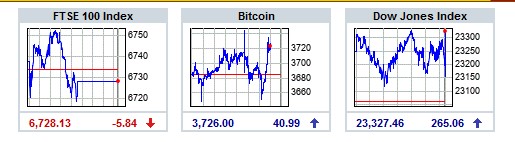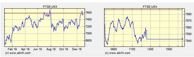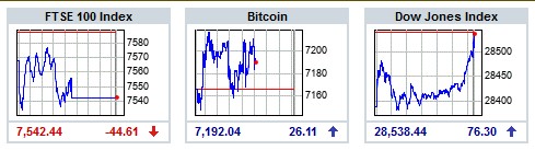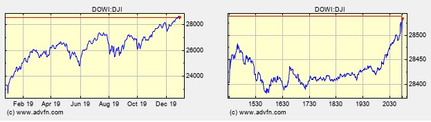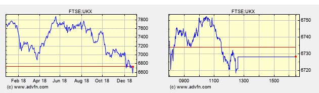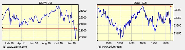 2018 FTSE 6,728.13 -0.0% L 6,718.32, H 6,752.54 2019 7,542.44 -0.6% L 7,532.38 H 7587.41 2018 Dow +1.1% 23,327.46 L 23,118.30 H 23,333.18 2019 28,538.44 +0.3% L 28,376.49 H 28,547.35