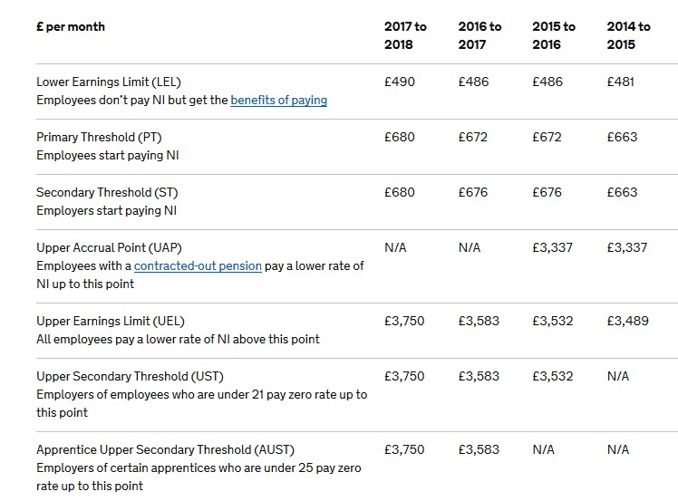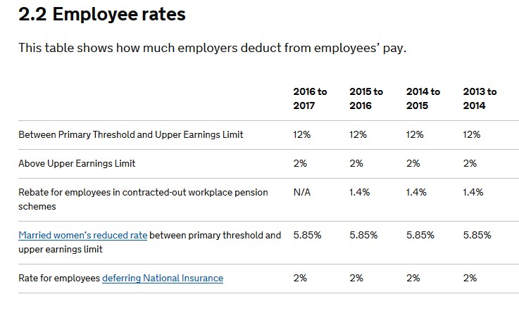 No NI is paid below the LEL. A rate if 12% applies between LEL and UEL A rate of 2% applies above UEL Note the last 2 lines referring to employers. |