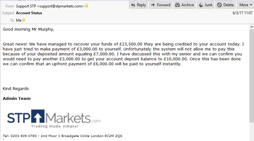 I was advised on 6th. March that they had recovered £23,500.00 but that my account deposit needed to be £10,000.-- A further £3,000.00. At this point the addition of the recovered funds "incurred charges of £380.00 a day". I agreed to settle this - paying for one day. This £3380.00 was sent on 7th March and has cleared according to Charles Matthews. This does not, however appear on my account. I was also assured at this point by email (below) on 6th March that £6,000.00 would be paid to me instantly. |